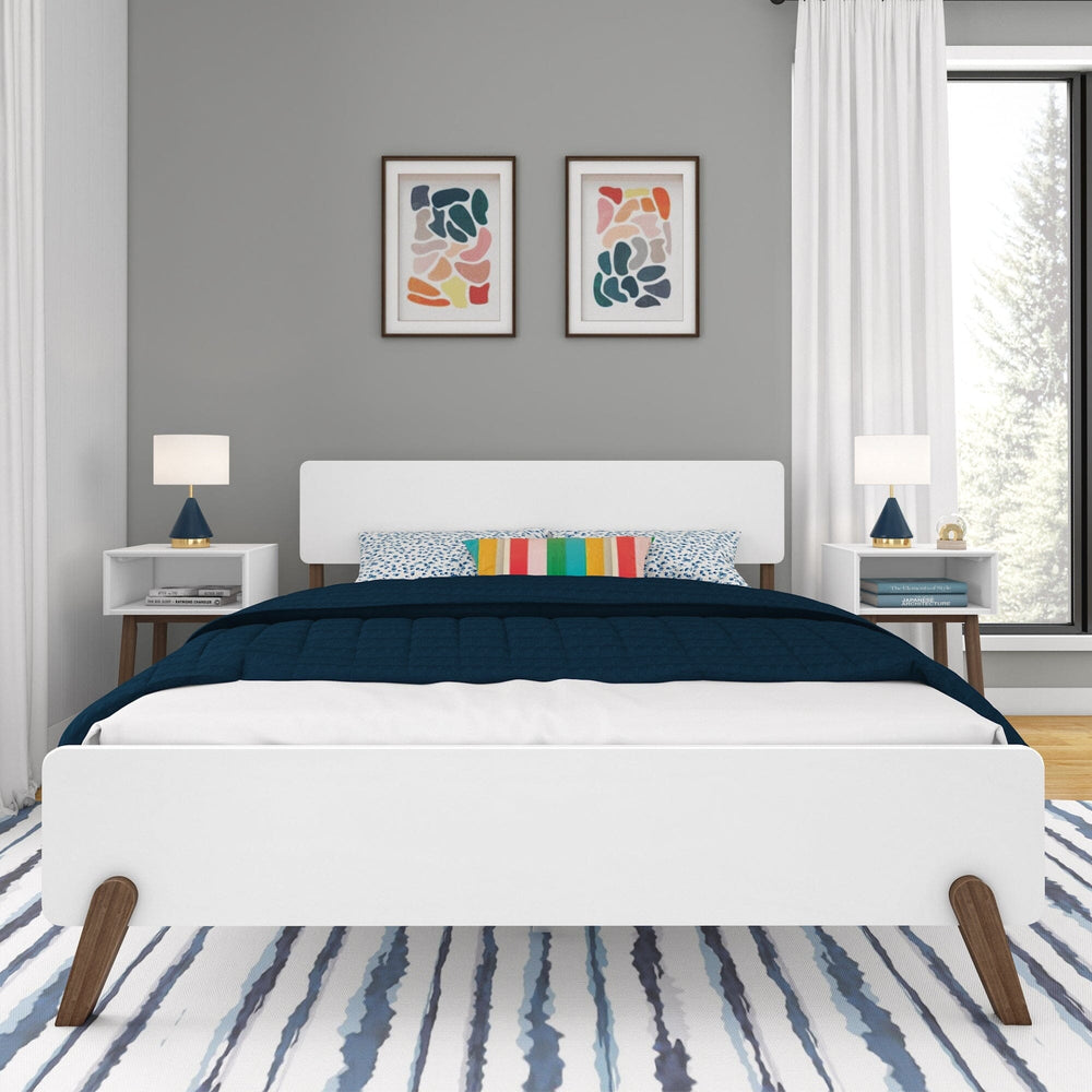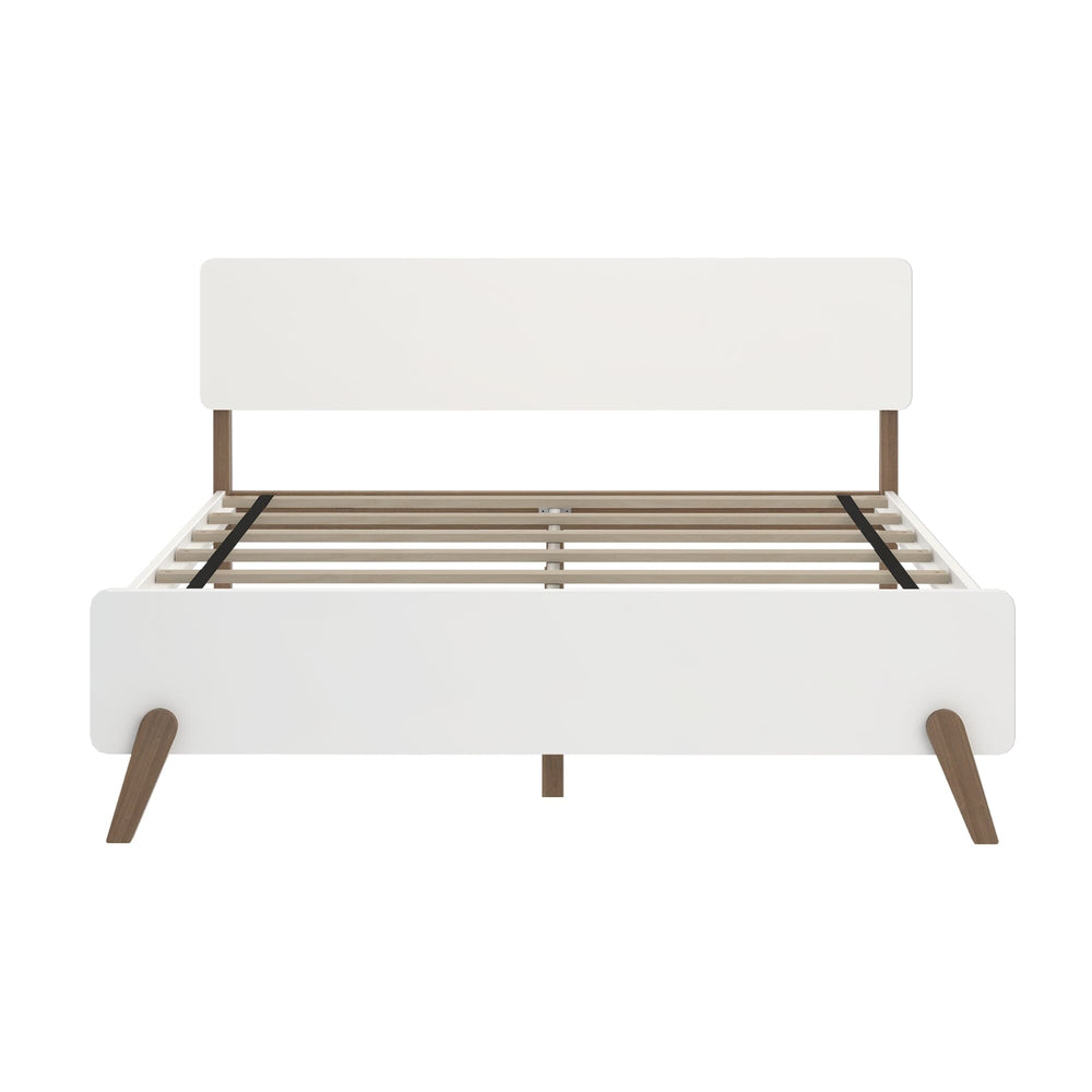 - Mid-Century Modern Queen Bed: Queen-size bed for kids is the perfect addition to any bedroom; Mid-century style features a two-tone white melamine and solid wood finish to showcase the natural wood grain and create a modern look