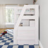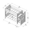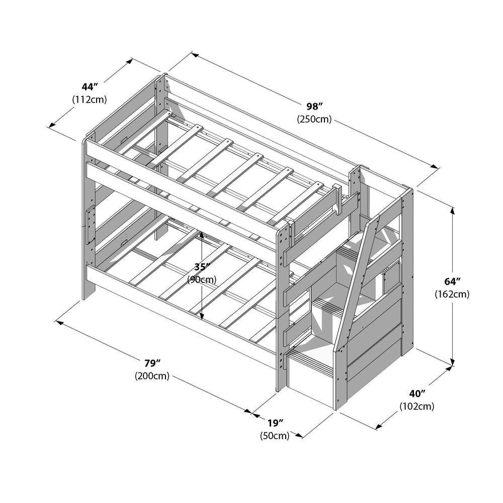 - Total Footprint: Bunk beds with stairs measure 98.5” L x 43.5” W x 63.25” H; Mattress placed on the top bunk cannot exceed a thickness of 8″.
